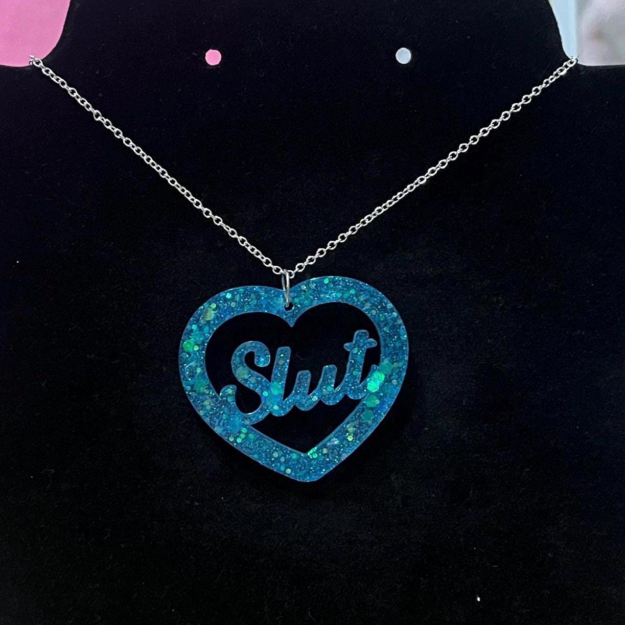 Handmade resin heart slut necklace pendant perfect for walks on the beach, a baptism or rave
