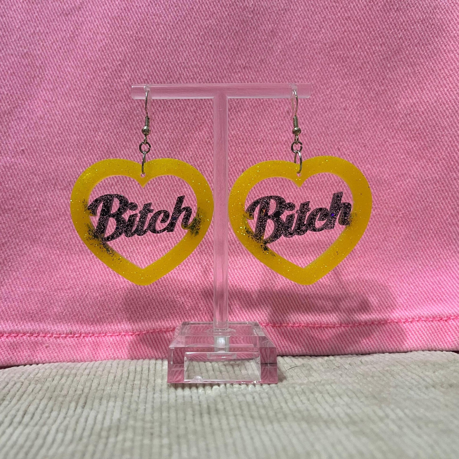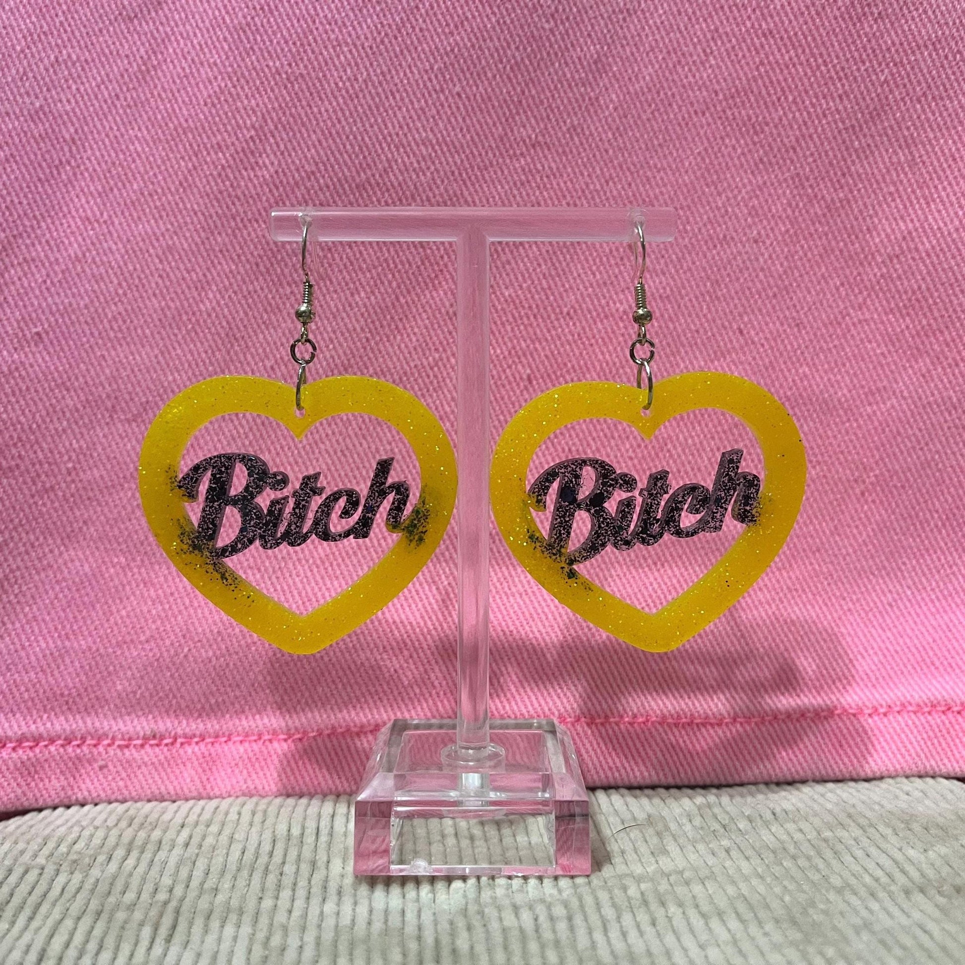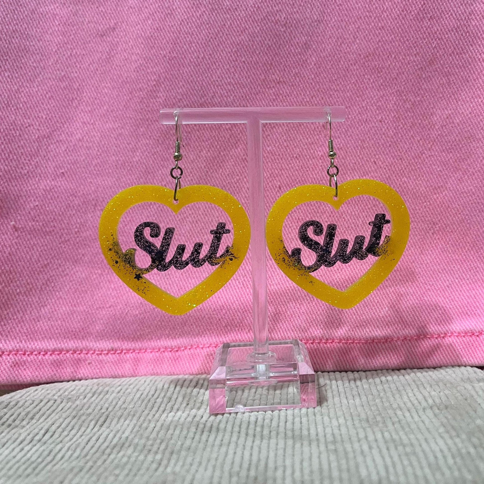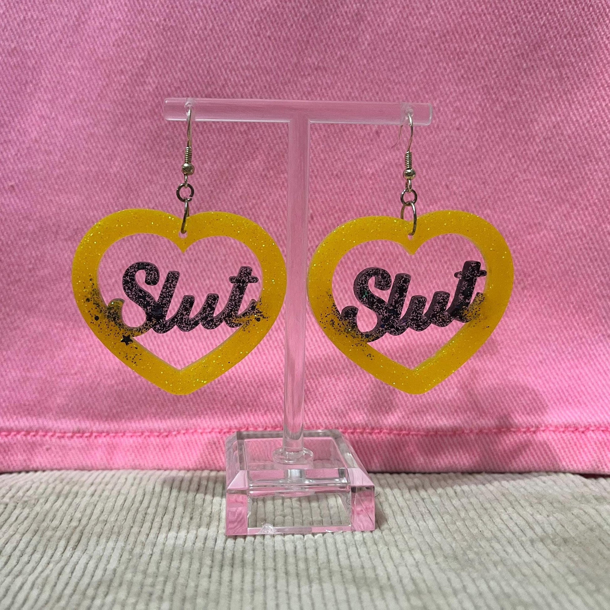 Black and Yellow glitter dangle drop clip on bitch or slut earrings