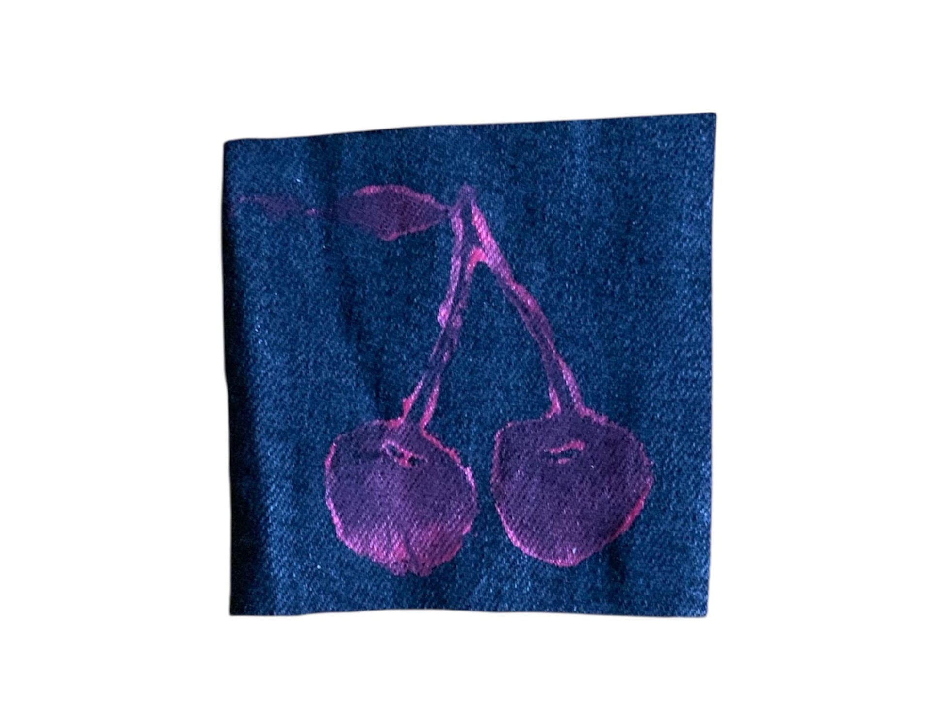Printed on recycled black denim, fabric paint, sealed, washable on low temperatures