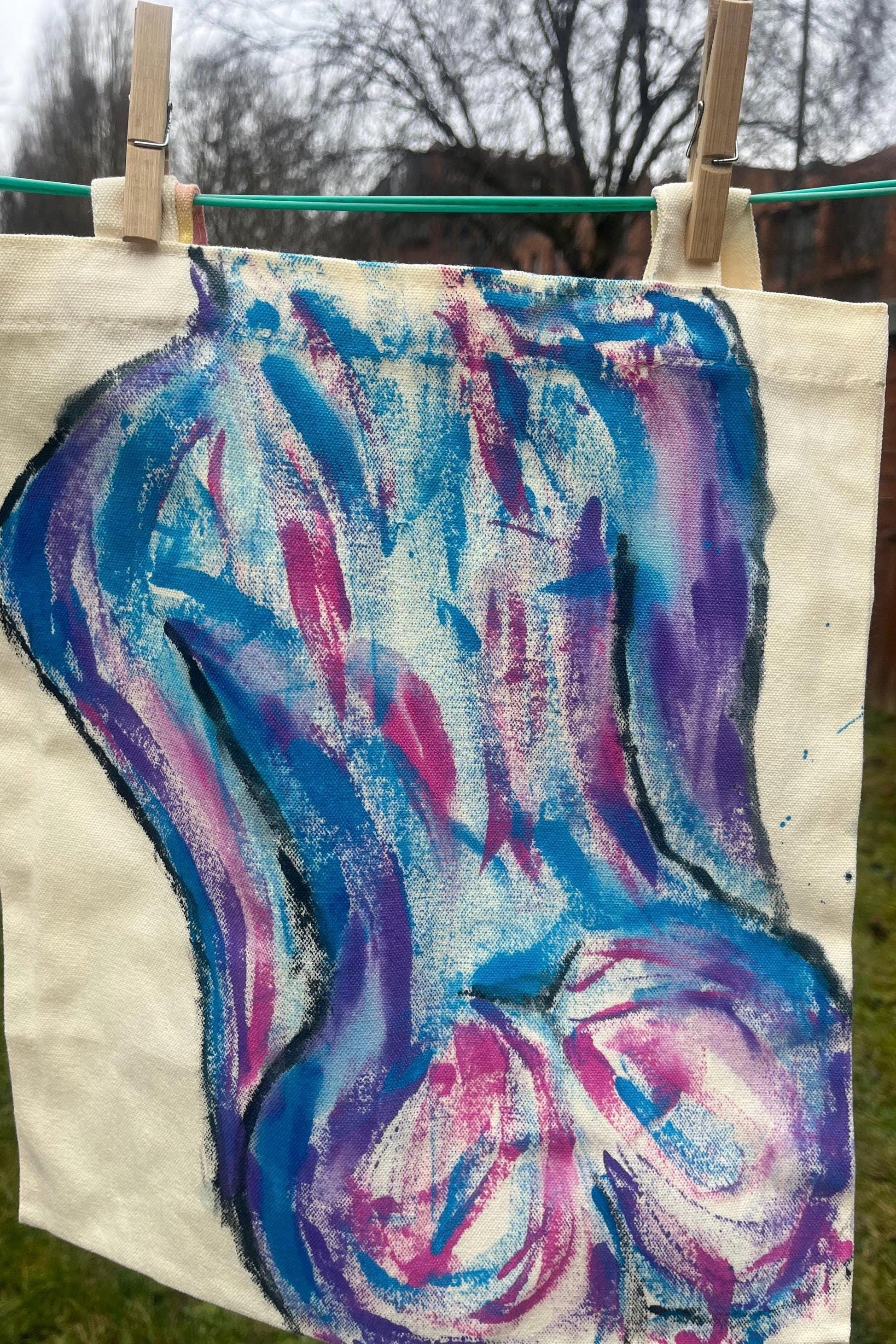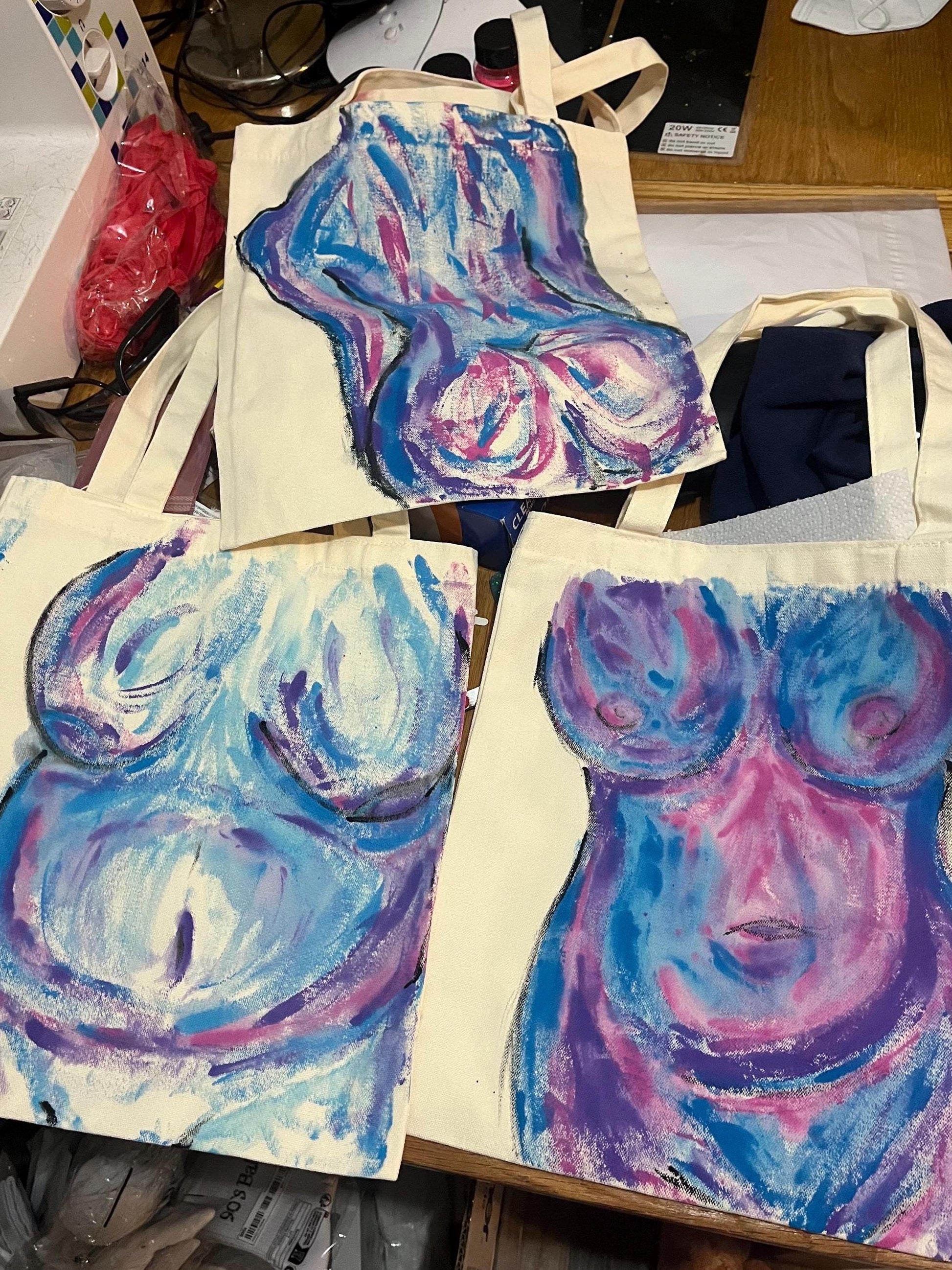 Gorgeous nude body hand painted tote bags in blue, purple and pink.