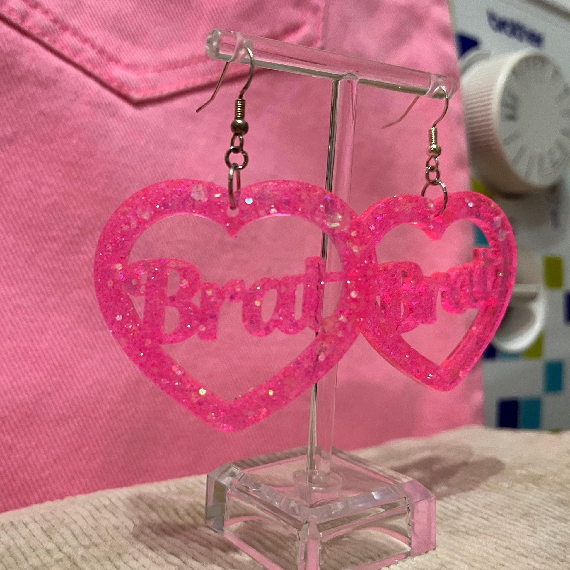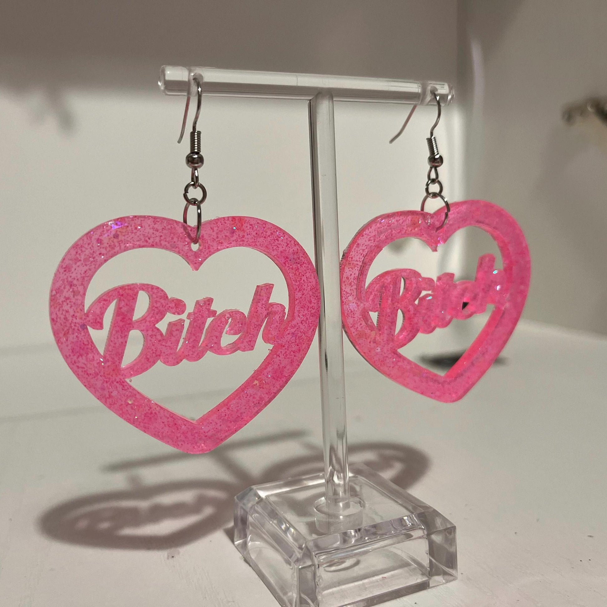 Pink glitter bitch or brat dangle drop earrings or clip ons