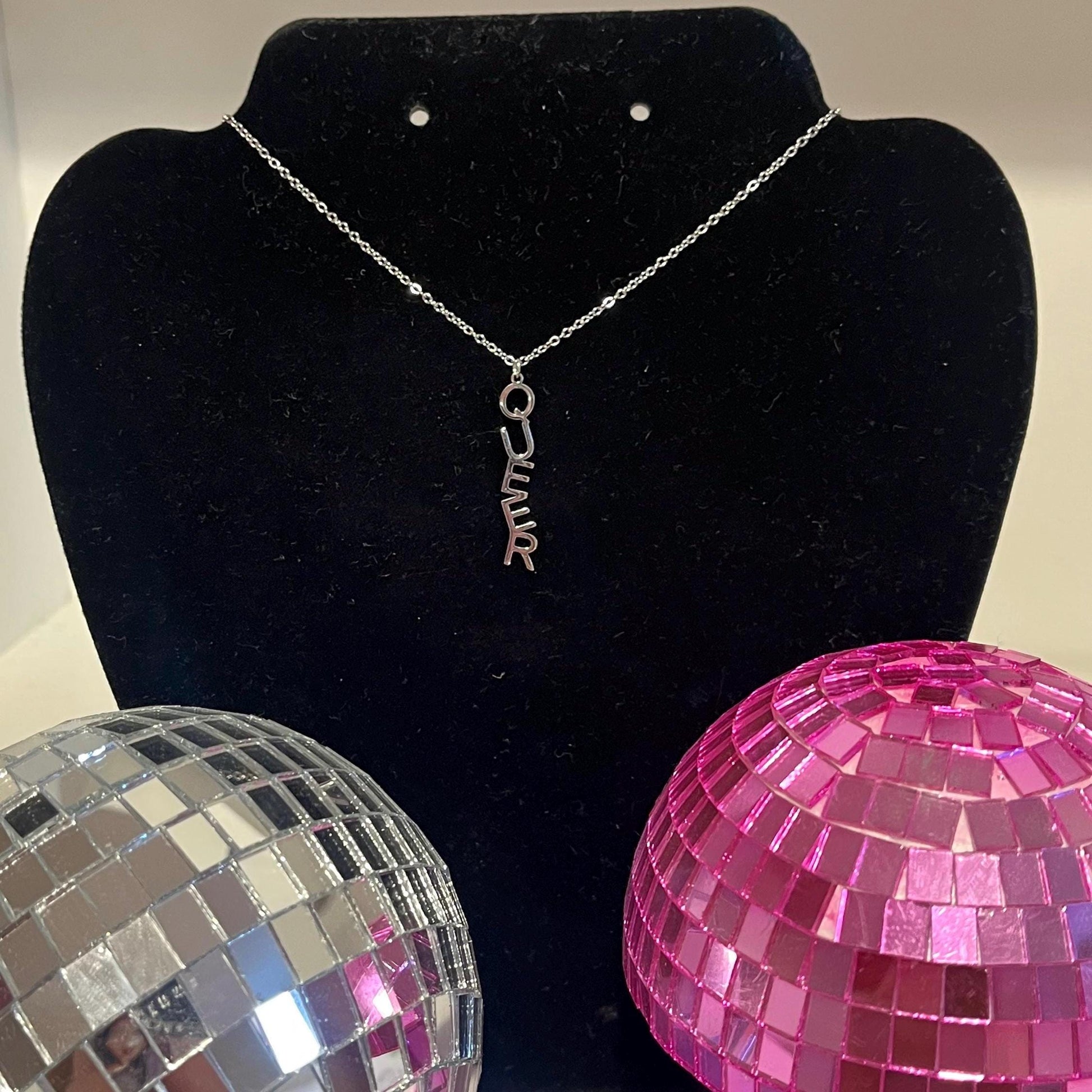 Gorgeous queer lettered stainless steel necklace, perfect for Berghain or afternoon tea at the ritz